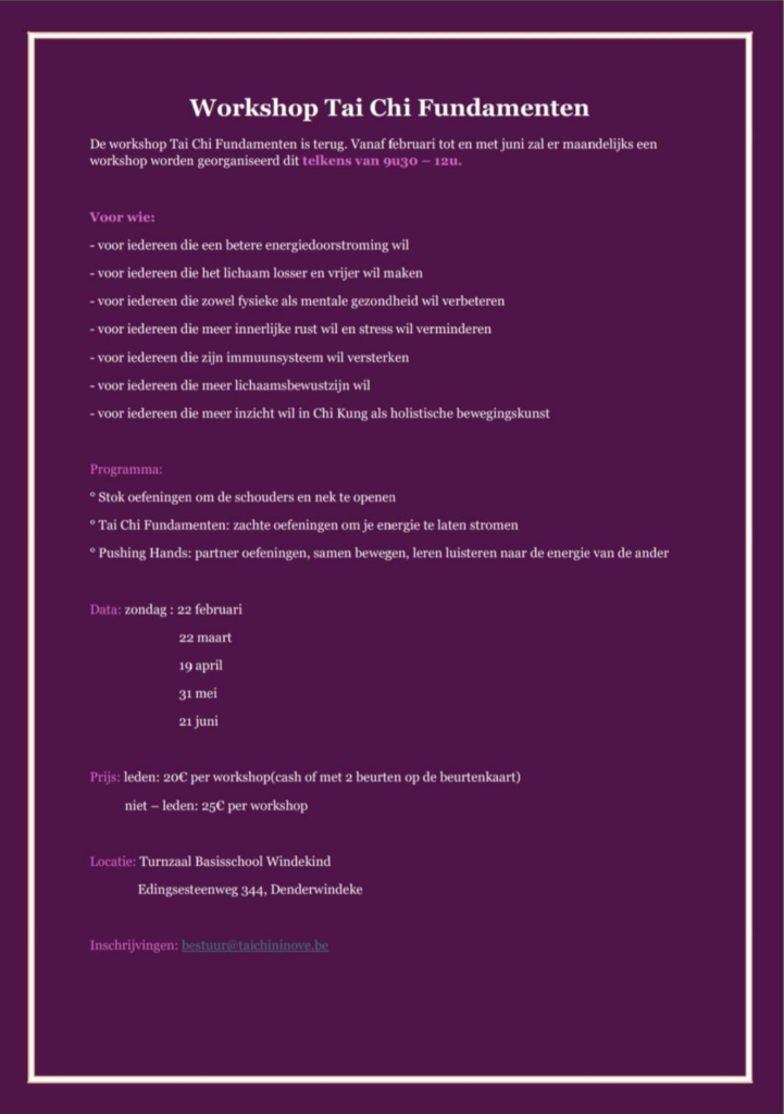 Heb je interesse of wil je meer informatie stuur een mail naar: bestuur@taichininove.be
